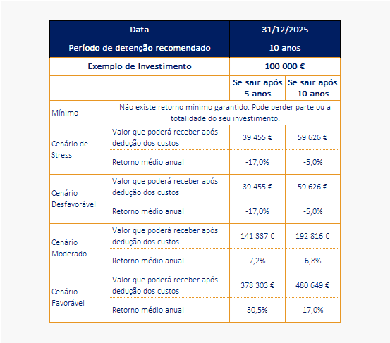 The scenarios presented illustrate how your investment might perform. You can compare them with the scenarios of other products. The scenarios presented are illustrations based on past results and certain assumptions. Markets may evolve very differently in the future. The stress scenario shows what you might receive in an extreme market situation and does not include the situation where the product is not in a position to pay you.
