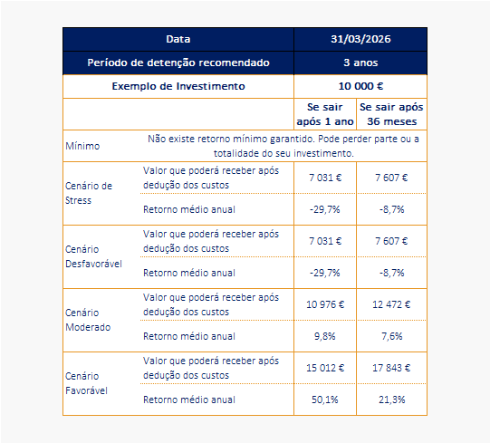 Os cenários apresentados ilustram qual poderá ser o desempenho do seu investimento. Pode compará-los com os cenários de outros produtos. Os cenários apresentados são ilustrações baseadas em resultados do passado e em determinados pressupostos. Os mercados poderão evoluir de forma muito diferente no futuro. O cenário de stress mostra o que poderá receber numa situação extrema dos mercados e não inclui a situação em que o produto não está em condições de lhe pagar.