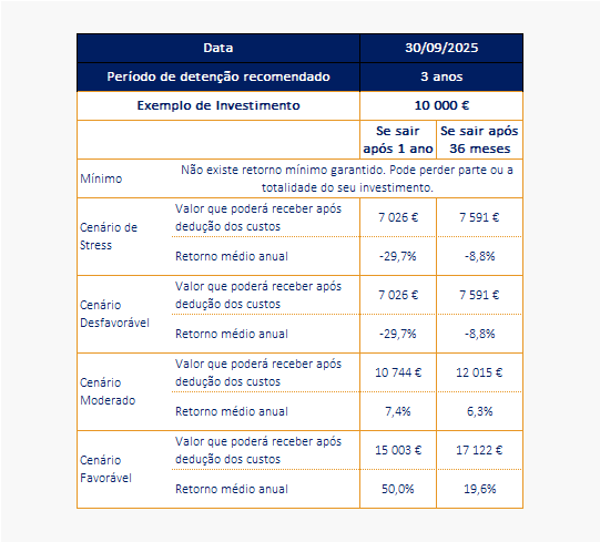 Os cenários apresentados ilustram qual poderá ser o desempenho do seu investimento. Pode compará-los com os cenários de outros produtos. Os cenários apresentados são ilustrações baseadas em resultados do passado e em determinados pressupostos. Os mercados poderão evoluir de forma muito diferente no futuro. O cenário de stress mostra o que poderá receber numa situação extrema dos mercados e não inclui a situação em que o produto não está em condições de lhe pagar.